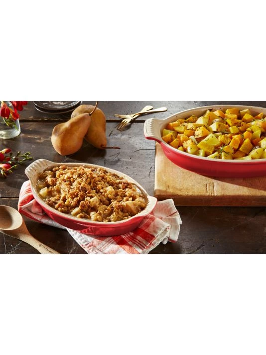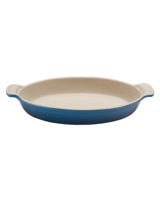 - For recipes that call for a crisp topping, the Heritage stoneware oval au gratin dish provides a wide, shallow cooking area in a variety of sizes, exposing ingredients more directly to heat. Its functional stoneware construction and variety of sizes also make the oval au gratin dish useful for everything from preparing individual sides that are small enough to fit on a dinner plate beside an entree to serving multiple portions at the table.