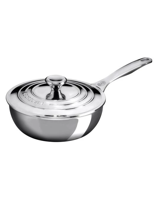 A saucier pan, sometimes called a chef’s pan, is designed with a rounded bottom to keep ingredients moving, and flared sides to facilitate easy whisking and stirring. It is particularly suited to dishes that involve constant stirring, such as sauces, risottos and custards.