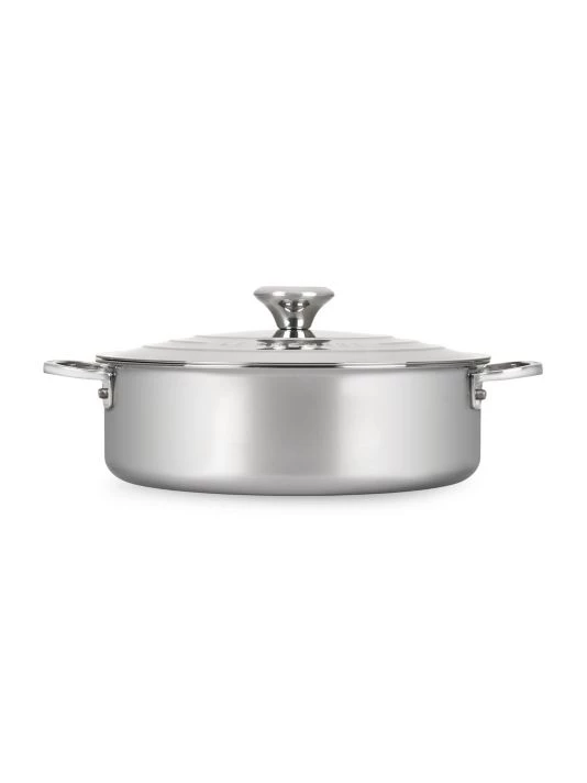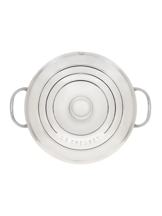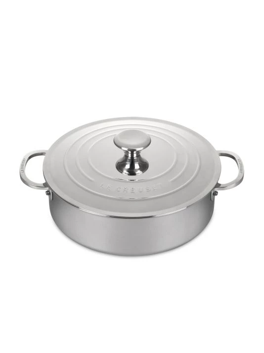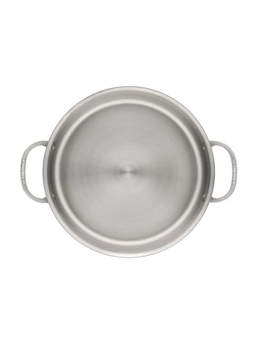 Le Creuset’s stainless steel rondeau is ideal for everything from searing and sautéing to braising and simmering. The versatile shape is a chef’s favorite, with deep sides to hold large batches of soups and stews, and a generous wide cooking surface ideal for reducing richly flavored stocks and sauces. Radiant and durable, the triple-layer construction features a full base-to-rim aluminum core for superior heat distribution, while the lightweight titanium-infused stainless steel exterior resists scorching and corrosion at higher temperatures.