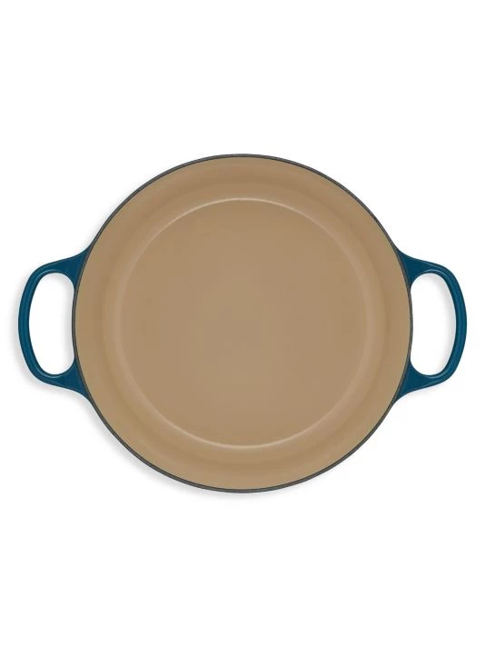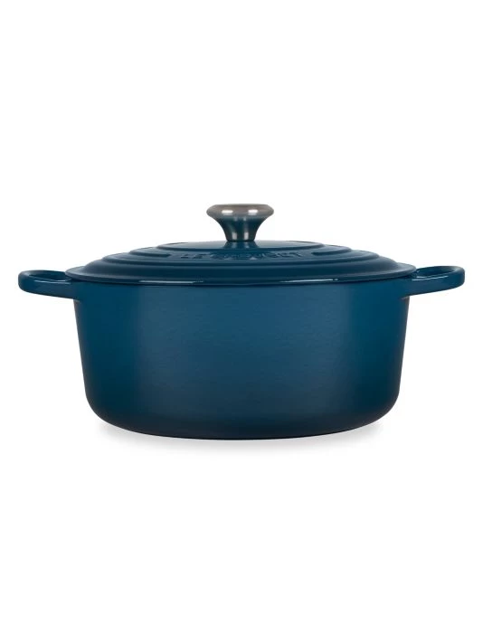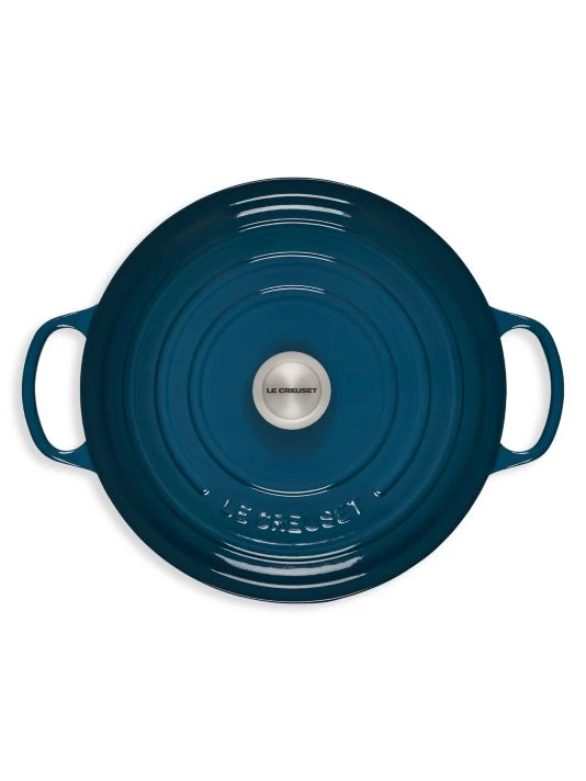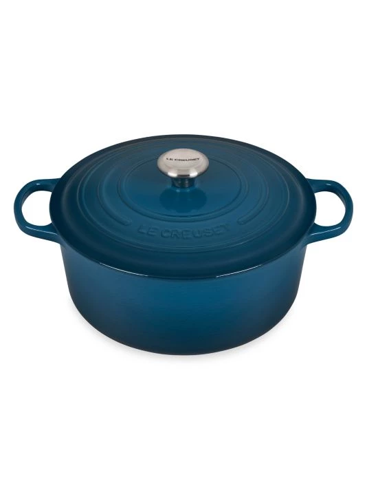 The iconic Le Creuset Dutch oven is indispensable in the kitchens of home cooks and professional chefs alike. Long recognized for its strength and durability, cast iron is the prime material for slow-cooking, braising and roasting, thanks to its ability to maintain even and consistent heat. The enameled Dutch oven needs no seasoning, and it’s suitable for both stovetop and oven use. Colorful exterior enamel is shock-resistant to prevent chipping and cracking. Sand-colored interior enamel has a smooth finish that promotes caramelization, prevents sticking and resists stains. Dome-shaped lid locks in flavor by promoting continuous circulation of heat and moisture. Wide loop handles provide a safe and comfortable grip. Stainless steel knob is safe at any oven temperature.