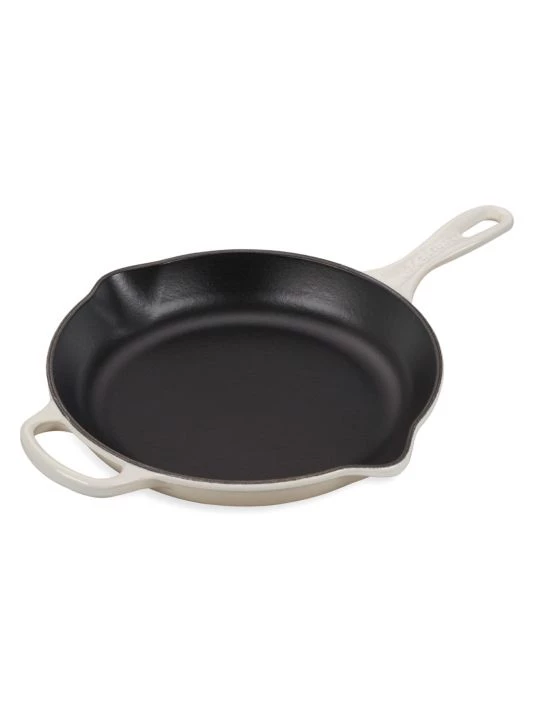Cast iron skillets are indispensable in the kitchens of home cooks and professional chefs alike. The interior surface of a Le Creuset skillet is finished with a matte black enamel that eliminates the need for the traditional seasoning and maintenance of raw cast iron. Specially formulated for high-surface temperature cooking, the enamel develops a natural patina over time that is ideal for searing, sautéing and frying.