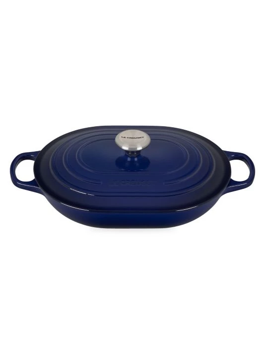 Long recognized for its strength and durability, cast iron is the prime material for slow-cooking, braising and roasting, thanks to its ability to maintain even and consistent heat. The enameled oval Casserole needs no seasoning, and itβs suitable for both stovetop and oven use. The oval shape is particularly suited to longer cuts of meat or poultry. The gentle sloping base is ideal for roasting and baking. Colorful exterior enamel is shock-resistant to prevent chipping and cracking. Sand-colored interior enamel has a smooth finish that promotes caramelization, prevents sticking and resists stains. Dome-shaped lid locks in flavor by promoting continuous circulation of heat and moisture. Wide loop handles provide a safe and comfortable grip. Stainless Steel knob is safe at any oven temperature.