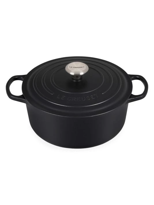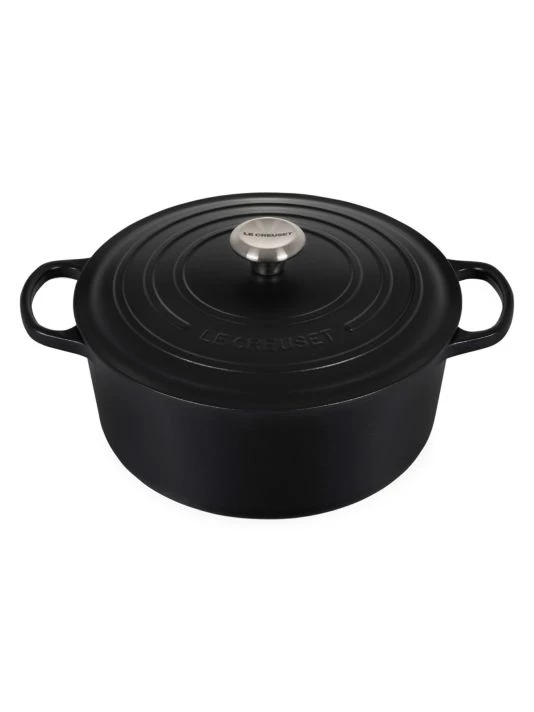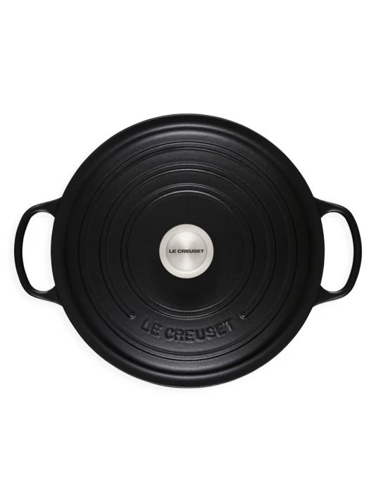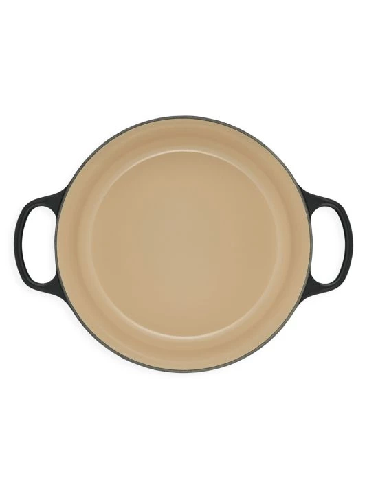 This brand produced the first enameled cast iron cookware nearly a century ago, and the original foundry still operates today, where 15 skilled artisans hand-inspect each piece. This tradition of the finest culinary craftsmanship, combined with the latest innovations in comfort and functionality, make this brand unsurpassed in both beauty and quality. Exterior enamel is shock-resistant to prevent chipping and cracking. Sand-colored interior enamel has a smooth finish that promotes caramelization, prevents sticking and resists stains. Dome-shaped lid locks in flavor by promoting continuous circulation of heat and moisture. Wide loop handles provide a safe and comfortable grip. Stainless steel knob is safe at any oven temperature. No seasoning required.