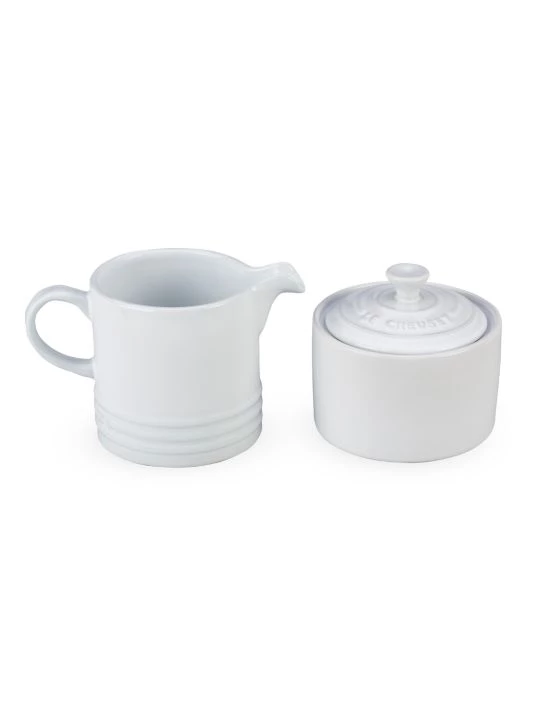 Enjoy coffee in style with this bold Le Creuset cream and sugar set. The cream pitcher’s spout ensures drip-free pouring and the lidded sugar jar keeps sugar protected. Dense stoneware prevents moisture and odor from entering or escaping, and a tough, enamel finish resists chipping, scratching, and staining. Safe for use in the microwave, freezer, refrigerator, dishwasher, and broiler.