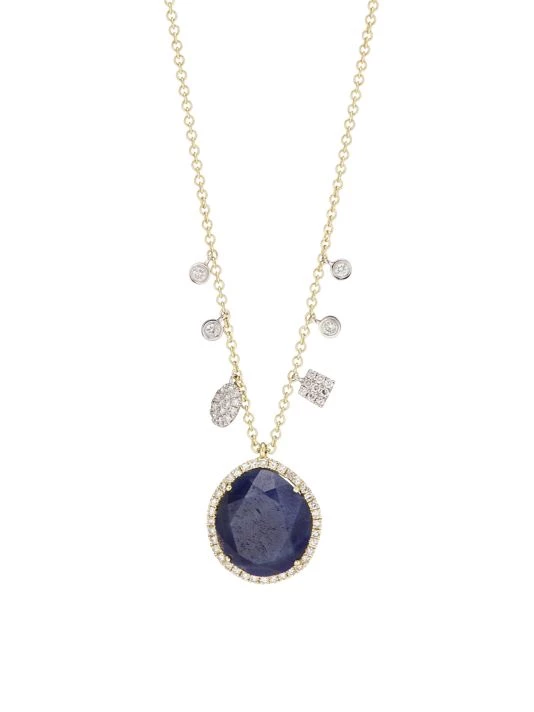 Diamond pavé frames this faceted sapphire pendant necklace, adorned with additional diamond-studded charms along the delicate chain.