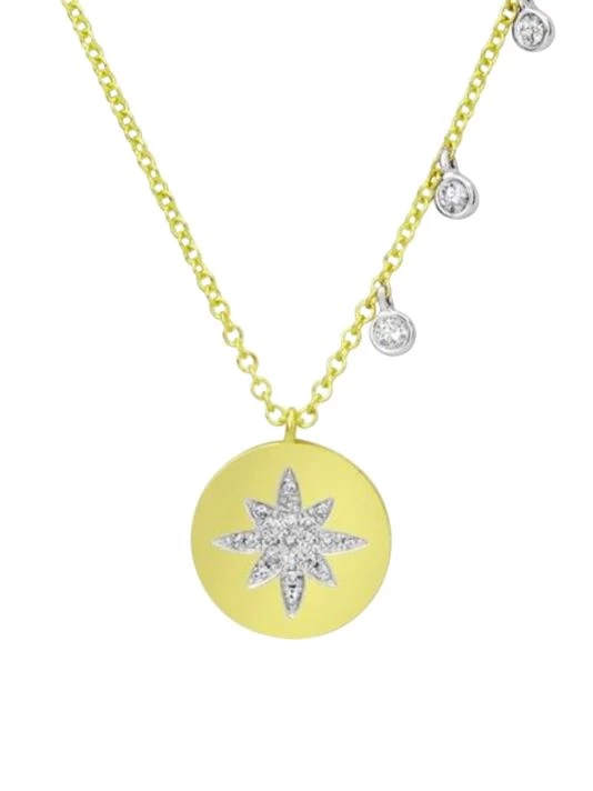 A diamond-studded starburst centers this golden disc pendant necklace.