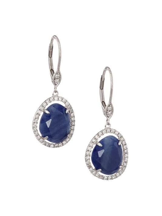 A diamond pavé halo surrounds faceted blue sapphires in a elegant drop earring shape.