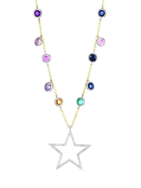 14K yellow gold chain dotted with an assortment of eye-catching stones suspends a pavé-set star pendant.