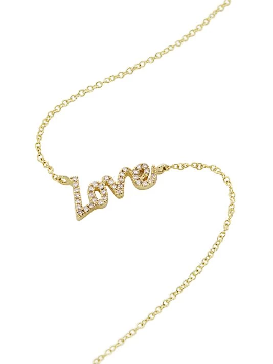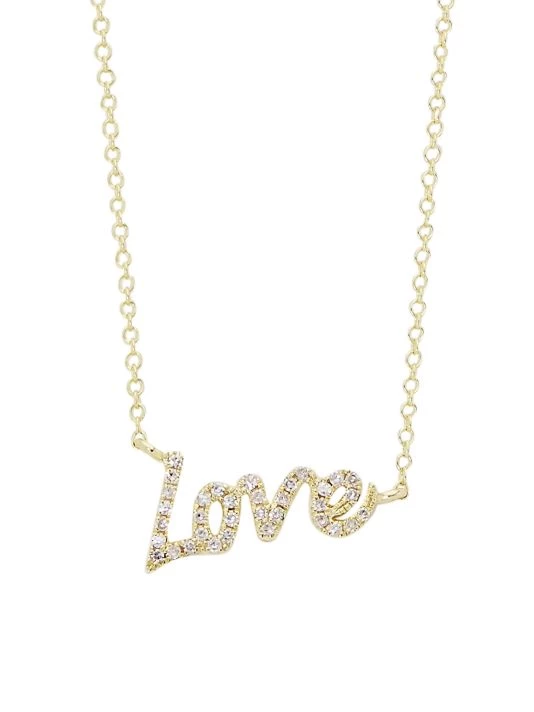 Designed as a nameplate necklace, this delicate style features a center diamond-studded love pendant.