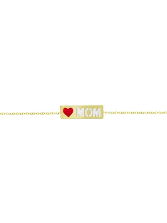 Made of 14K yellow gold, this elegant bracelet features a nameplate charm detailed with a red enamel heart and white mother-of-pearl ‘Mom’ lettering.
