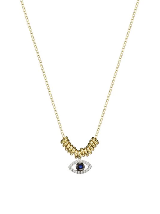 Set on a delicate 14K yellow gold chain, this necklace is accented with polished gold rings and a diamond and sapphire evil eye pendant.