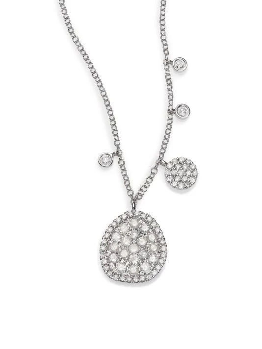 A necklace petite in proportion yet rich in shimmer, of a diamond disc, slightly irregular in shape, strung upon a trace chain of 14k white gold with delicate, asymmetrical solitaire and pavé charms detailing its sides.