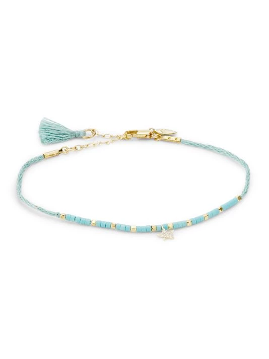 Crafted of braided fabric adorned with light blue and goldtone beads, this elegant bracelet features a petite white-diamond-encrusted star charm.